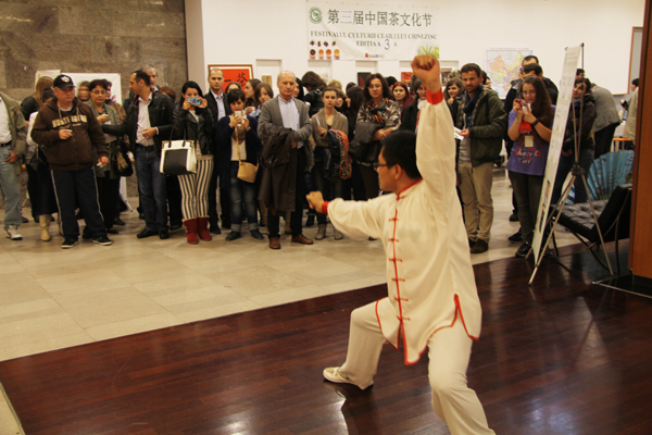 活动现场还为观众提供了许多互动节目:中国茶文化纪录片播放、中国文化书籍展示、抽取印有中国古代哲学家语录的罗语精致书签、中国剪纸体验、生肖文化讲解和中国传统益智游戏体验等。孔子学院学员Bogdan Misaila表演了中国的传统武术五行拳,腾挪跳跃中尽显武术神韵。孔子学院朱晓宾老师表演了梅花拳和四十二式太极拳,气韵生动,动作流畅。在中罗教师现场为观众用毛笔书写汉语名字的展台前,始终有热情的观众排队等候,成为本次茶文化节中最受欢迎的活动。