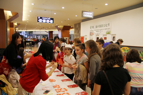 活动中,孔院工作人员用国家汉办赠送的精美茶具,介绍并展示了中国传统的茶道,包括冲茶的细节、茶的种类、品质鉴别、各类茶品的推荐,同时送出“茶与健康”的罗语宣传手册。观众络绎不绝,现场送出龙井茶、茉莉花茶、铁观音、普洱茶等总计1000多杯热茶。
