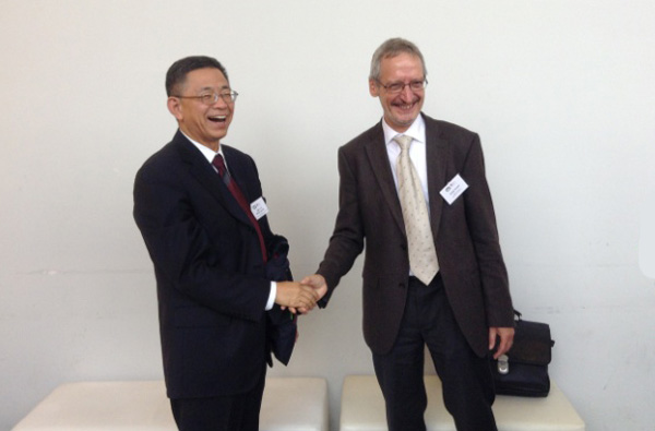 图6 王建华与中国驻汉堡领事馆总领事杨惠群交流
