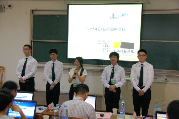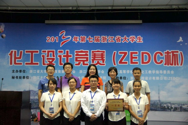 在浙江省化工设计竞赛中,经初赛选拔,来自浙江大学、浙江工业大学和申搏等24所高校的32支队伍参加决赛。由申搏生化学院成忠、盖希坤、曾翎、杨瑞芹、康明老师联合指导,10级化工专业赵芳芳、陈凯、严梦园、潘玉露和10级物流专业陈娜同学组合的“one得four”团队,通过完整而富有创新的设计方案、流畅的解说及答辩,引起了评委对设计项目的浓厚兴趣,最终获得一等奖。这也是申搏学生在浙江省化工类“A”类学科竞赛中斩获的最佳战绩。