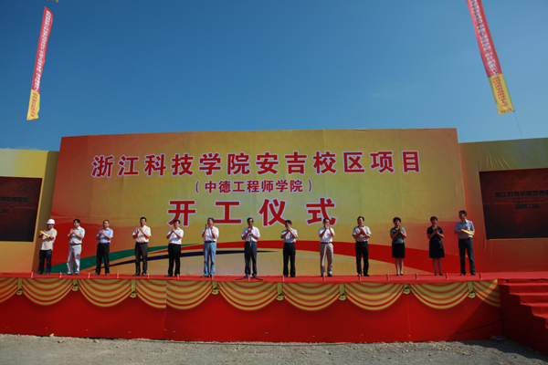 王建华代表全校师生员工及远道而来的德国留学生向安吉县委、县政府,湖州市委、市政府表示衷心感谢,对省政府、省教育厅、发改委、财政厅等各级领导在项目筹建过程中给予的关心和支持表示衷心感谢。他说,中德工程师学院落户安吉,是浙江科技学院、安吉县携手强化创新驱动,贯彻科教人才强省战略的共同选择,也是校地联姻结亲,共图科学发展的良好开端,使浙江科技学院的发展有了一个新的平台,也使安吉的大学梦正式开启。在接下来一两年的时间里,项目建设时间相当紧张,任务十分繁重。希望与安吉县一起,加强沟通,有效协作,希望并要求项目建设单位、设计单位、施工单位以争创“鲁班奖”为工作目标,以铁的意志、火的激情,全力做好各项建设工作,确保把项目工程建成国内高校一流的质量工程、安全工程、品牌工程和廉洁工程。