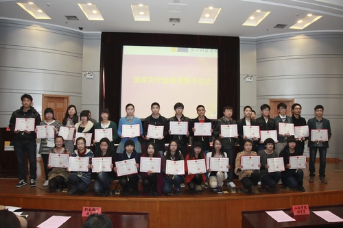 赵东福宣读表彰文件。2011-2012学年申搏共评出“校特优学风示范班”10个,“校特优学风班” 13个,“校优良学风班”45个。26名同学获得国家奖学金,490名同学获得国家励志奖学金,910名同学被评为三好学生,3438人次获评校级各类奖学金。