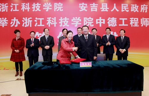 签约仪式上,湖州市委书记马以代表市委、市政府对浙江科技学院中德工程师学院的落户表示祝贺。他说,这次浙江科技学院中德工程师学院选择落户安吉,是省内高校优质教育资源与湖州及安吉区位交通、生态环境、人文历史、特色产业等优势条件的又一次成功对接,对加快湖州高等教育发展,促进教育、科技、人才与经济社会发展紧密结合将发挥积极作用。马以希望安吉县与浙江科技学院密切配合,创新校地合作机制,以市场需求为导向,以质量建设为核心,把育才与育人紧密结合起来,积极打造特色品牌,努力把中德工程师学院建成“省内一流、国内知名、特色鲜明、学生向往”的高校,为安吉、湖州乃至全省的发展提供有力的人才保障。