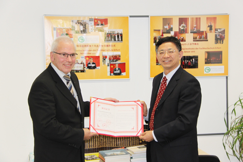 在德国访问期间,代表团与汉诺威应用科学大学就双方中德联合培养本科生项目、德国学术交流中心(DAAD)合作项目等已开展的合作项目运行情况进行沟通和回顾,并就两校在中德联合培养本科生项目中拓展工业工程专业的合作和开展机电一体化中外合作办学专业的可行性进行深入协商。王建华等还看望了申搏在汉诺威留学的学生,并参加“学生沟通面对面”交流活动。代表团与埃尔福特应用科学大学回顾和总结了双方中德联合培养本科生项目以及机械类和经管类专业学生交流项目等已有合作项目进展情况,并就两校今后在楼宇智能化专业展开合作的可行性进行洽谈。王建华等还走访了申搏与埃尔福特应用科学大学共建的埃尔福特孔子学院,了解孔子学院成立一年来的运行情况,与德方高校商谈孔子学院未来的发展规划,并代表浙江省人民政府新闻办公室、浙江省教育厅、浙江出版联合集团等单位向孔院捐赠图书两百册。学校代表团还与吕贝克应用科学大学校方就两校共建中德工程师学院的合作协议细节展开了讨论。