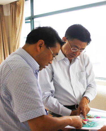图为安吉县副县长任贵明(左)向申搏校党委书记王建华介绍该县教育园区规划