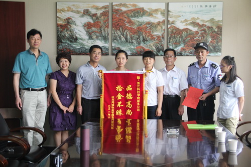 近日,杭州同诚物业管理有限公司委托翰墨香林苑管理办公室工作人员来到后勤公司,送上了“品德高尚、拾金不昧”锦旗和感谢信。后勤公司女员工梁田(上图左五)、夏枫(上图左四)日前捡到了一个装有2万余元现金和公司发票、存折等重要物件的文件袋,主动归还给了失主同诚物业翰墨香林管理办财务人员宋小姐。送来锦旗时,同诚物业工作人员说,除现金外文件袋内的存折上还有14万余元存款。
