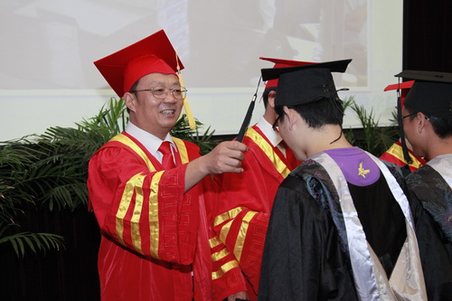 6月19、20日,2012届毕业生学位授予仪式隆重举行。毕业生们从校领导及校学位委员会成员手中领取了自己的学位证书。师长还为每位同学拨正学士帽上的流苏。校长杜卫教授与每位毕业生合影留念。