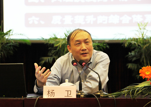 杨卫在报告中说,西方大学制度以追求院校自治、学术自由、通识教育和批判思维为特征,在具体的管理制度上,传统的英联邦国家、欧洲大陆国家、美国大学、日本大学等都有各自的运行模式。近年来,各国大学也都在根据形势探索改革。他详细介绍了海外大学的制度与治理结构。随后,杨卫就中国特色一流大学之路、学术权力与行政权力配平、内涵发展的I模式以及质量提升的综合体系等4个议题进行了深刻的、富有见地的阐析。他认为,与许多西方一流大学所采取经典模式不同,中国研究型大学近20年的发展选取的是一条不同寻常的道路。它综合了学术权力与行政权力,结合了院校法人制与中央政府指导,融会了通识教育与专业教育。杨卫还以浙江大学为例,详细阐述了内涵发展的I模式所包含的四个转变:从总量到人均的转变,关注反映内涵的人均指标和强度量;从同质化到特色化的转变,实施“和而不同”的科学管理和政策体系;从单一学科向学科交叉发展,夯实学科交叉的四个基础;从数字提升到形象塑造的转变,塑造声誉是一个逐步提高的过程,内涵发展的目标是构建国际公认的品牌声誉。他认为,质量提升是学术提升、学风提升、学科提升以及学脉提升的一个综合体系,需要协调发展。