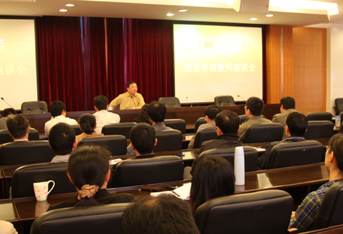 4月12日,校长杜卫在信息学院召开的全体教职工大会上进行宣讲。他回顾了学校的办学历程,充分肯定了学校发展取得的成绩,指出学校今后发展的目标和任务。杜卫针对信息学院实际提出了工作要求,增强教职工的凝聚力,加强团队建设,抓好课程群建设,鼓励教师尤其是青年教师提升自己的能力和水平。13日上午,杜卫走进教室,旁听“教育技术学”课堂教学,下午与学生代表进行座谈,了解学生的学习情况,倾听学生对教学的意见和建议,就如何发挥学生的学习自主性进行探讨。