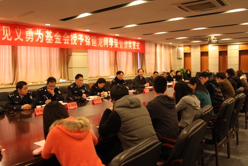 3月23日,机械学院大四学生徐建龙被授予杭州市“见义勇为积极分子”荣誉称号。当天,颁奖仪式在申搏举行。杭州市见义勇为基金会秘书长姜建生为徐建龙颁发了奖状和奖金。