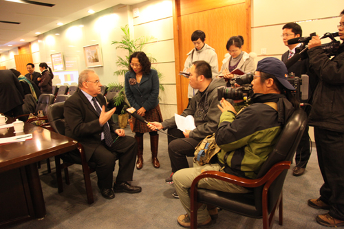 座谈会前,安德烈•玛格等接受了钱江晚报、浙江电视台教育科技频道、浙江在线等媒体记者的采访。玛格说:“在与中方共建孔子学院的2年时间里,我见到了不少罗马尼亚学生主动地参与到中国文化的学习当中去,这在东欧地区是非常罕见的事情。”他还表示,这一合作让越来越多的罗马尼亚人认识了杭州这座美丽的城市,希望越来越多的中国人能到罗马尼亚去。