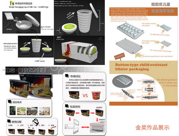 近日,2011届中国包装之星竞赛举行,申搏轻工学院包装工程专业学生一举夺得3金2银6铜。高翔和黄芳的“纽扣式儿童安全泡罩包装”、陈合的“杯装奶茶简易包装”和沈静波的“自立+自封式折叠方便面”获得金奖。王忆仙的“回忆起小时候”环保CD包装和杜雅文的新型蜂蜜包装获得银奖;求佶锋的“啤酒包装——皇冠盖改进”等6组获得铜奖。