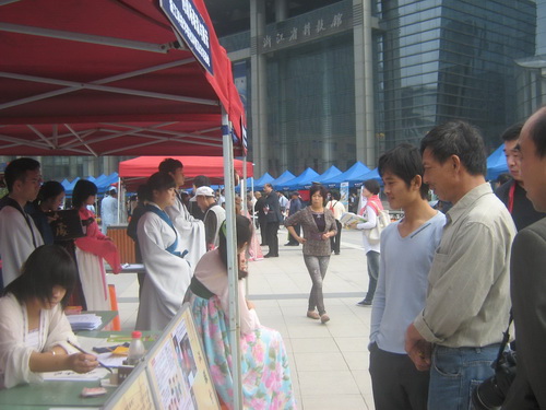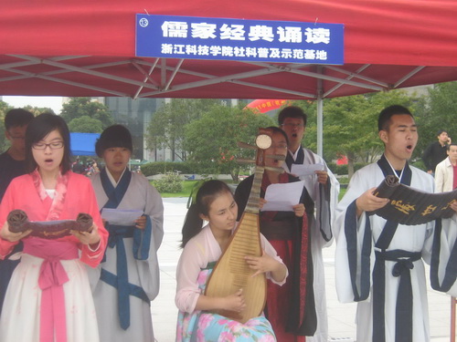 在开幕式后的广场咨询活动中,申搏精心准备了“汉服现场表演与展示”、“中华茶艺”、“儒家经典诵读”等3个主题的宣传活动。申搏学生精彩的琵琶演奏、娴熟的茶艺展示、富有韵味的书法表演、多彩的汉服展演以及琅琅上口的儒家经典现场诵读,使整个广场充满着中国传统文化的气息。活动期间,不少身份各异、年龄不同的参观者来到申搏展位前,询问有关汉服、茶艺、儒家经典文化的知识,来自申搏孔子学堂的同学们一边演示一边做了详细解答。咨询活动还吸引了现场众多媒体的关注。