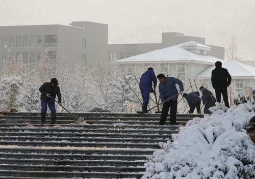后勤公司紧急调用工业盐,对人流量大的进出口及主干道实施化雪。后勤青年突击队连夜两次冒严寒巡逻在校内各主要道路上,用竹枝敲打去除树枝上的积雪。花卉暖房落实专人,防护花草。天冷用电负荷大增,对重点部位实行专人值班,保障重点区域用电正常。饮服中心做好蔬菜等物资储备。车队做好出车时防冻、防滑工作,提醒驾驶员注意行驶安全。同时,针对下雪学生摔伤等,医务所也加强了医务力量。