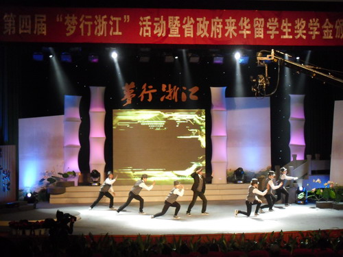 由浙江省教育厅主办的第四届“梦行浙江”外国留学生中华才艺展演暨“浙江省政府来华留学生奖学金”颁奖活动日前举行。浙江省委教育工委副书记、省教育厅副厅长蒋胜祥,、省委宣传部副部长兼省政府新闻办公室主任吕建楚及浙江省各高校的相关领导等出席活动。几内亚留学生Cisse代表申搏22名获得“浙江省政府来华留学生奖学金”的留学生上台领奖。