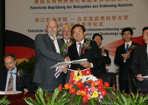 10月12日,正在浙江访问的德国石荷州州长彼德•卡斯藤森及石荷州代表团一行莅临申搏访问。省委教育工委副书记、省教育厅副厅长蒋胜祥,省外办副主任顾建新及申搏党政班子成员出席欢迎仪式暨浙江科技学院与德国吕贝克应用科学大学合作签约仪式。