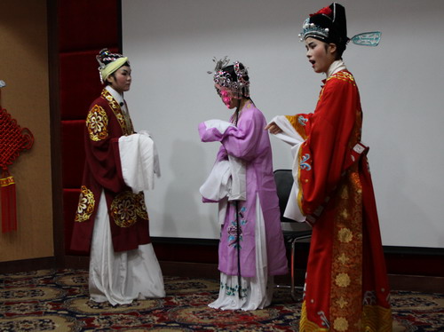 欢送会上,浙台两地学子共同欣赏申搏学生精心准备的现场书法表演、魔术表演、越剧《送凤冠》、歌曲《朋友》。台湾师生也为我们送上《雨夜花》等台湾民谣演唱。
