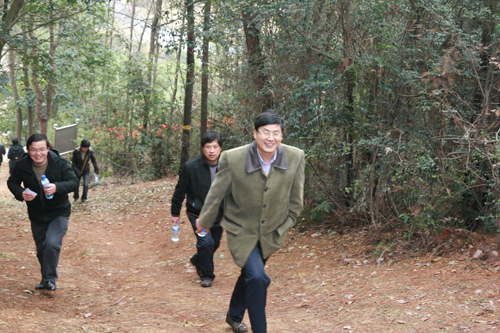 结束了连日来的阴雨连绵,太阳终于露出了笑脸。刚到中午时分,教工们三五成群地来到校园登山入口处,沐浴着冬日的阳光,沿着山路蜿蜒而上。走出教室、实验室、办公室,走进大山、走进森林、走进绿色,亲近大自然,教工们心情格外舒畅,一路走来,有说有笑。攀登到险要处,你帮我,我扶你,还有学生志愿者为老师们保驾护航,到处显现出互帮互爱的和谐景象。