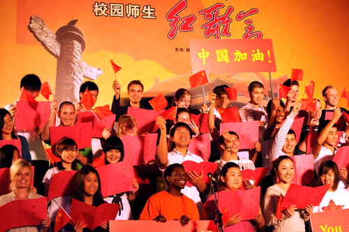 《今天是你的生日》《我的中国心》……深情的演绎表达了师生对新中国60华诞的祝福,《游击队歌》《弹起我心爱的土琵琶》……红色经典歌曲把人们带回到60多年前的峥嵘岁月;《中国朝前走》《在灿烂阳光下》……优美动听的歌声唱出人们的美好新生活。各学院方队和教工合唱团、红蜻蜓大学生合唱团用一首首歌曲为祖国母亲接力送祝福。外国留学生代表唱起《茉莉花》,带来对中国的祝福;少数民族学生们用《爱我中华》表达了他们对祖国母亲的爱。歌咏会现场高潮迭起,精彩不断。