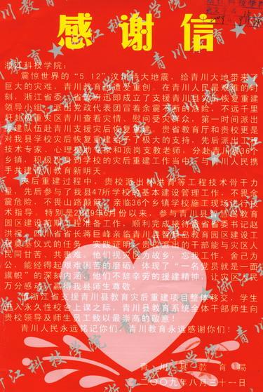 近日,青川县教育局向申搏发来了感谢信,感谢谢申搏选派人员赴该县支持青川地区教育事业灾后重建。