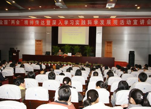 杜卫指出,就申搏而言,深入学习实践科学发展观,贯彻领会全国“两会”精神,就要深入思考如何在全国高等教育提高质量的主旋律下实现学校科学发展、快速发展。他说,学校刚刚被列为硕士学位授权立项建设单位,党代会提出全面建设特色鲜明的高水平应用型大学的奋斗目标,学校发展将进入新的阶段。同时,一些困难和挑战正在阻碍学校的发展,观念和习惯、管理、资金三大问题制约着学校的的发展,我们要正确面对和妥善处理这些困难和挑战。杜卫强调,学习实践科学发展观,就是要按照科学规律办学,把科学的理论应用于学校的改革发展,我们要以学科建设为龙头,以教学工作为中心,推动学校全面发展。
