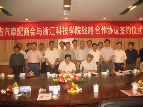签约仪式前,浙江省汽摩配商会举行了一届六次会长会议。丁耀民在致辞中表示,汽摩配行业作为浙江众多产业中的重中之重,对我省经济发展起到了举足轻重的作用。浙江科技学院机械学院车辆专业是全省较早的车辆专业之一,具有很强的科研实力。相信通过学校和行业的强强联合,能进一步探索校企合作机制,实现学校教学科研、人才培养和企业长远发展、员工培训的双赢。希望通过学校和行业的强强联合,打造产学研平台,共同推动汽摩配行业的科技开发与推广,推动汽摩配行业制造与装备自动化技术等研究成果的技术转移和产业化。