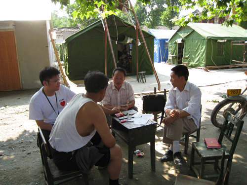 下午我们查看了金台小学的受灾情况,全校的教学办公楼、食堂、学生和老师宿舍都严重受损,成了危房楼,临时校舍和校园重建都需要异地建设。杨校长向我们介绍当前当务之急是临时校舍的布局规划,希望我们能在这方面做一些工作。听了以后我们当即要求去临时校舍建设地点查看,了解现场情况和学校对临时校舍建设的要求,以便我们开展工作。