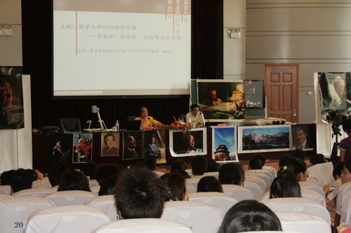 当天的报告中,魏德运教授从三个“痛”带我走上摄影之路开始讲述那些瞬间的永恒——镜头下大师们的点点滴滴。魏教授强调在日常生活中要善于捕捉,在与人沟通时,言语要能够打动人。谈起为季羡林、金克木、张岱年等大师们的拍摄过程,魏教授记忆犹新。每一张作品都蕴含了一个故事:初见季老心中很是忐忑,但季老很随和。在与季老的一次交谈过程中,一只叫毛毛的小猫突然从书架上跳下来,落到季老肩上,征得同意后,镜头定格了瞬间,也成就了金克木先生所谓“天人合一”的《季老与猫》。报告会中,魏教授还向我们展示了其他一些作品也分享了这些作品的故事。
