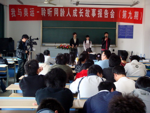 本次报告会以“我与奥运”为主题,经管学院张晶晶和信息学院徐斌同学分别以奥运火炬手及助跑手的身份为在场的同学们带来了他们精彩的成长故事。