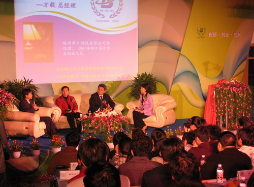 浙江卫视新闻主播许婷主持了创新创业峰会。浙江大学教育部科教发展战略研究中心主任陈劲教授,浙江省浙商研究会执行会长、浙江省团校副校长王曙光,安德维(中国)网络传媒有限公司CMO郭羽,邦达物流公司董事长孙震,以及07年浙江省大学生创业之星方毅与在场学生畅谈创新思维与创业人生。专家学者深刻剖析了知识、技术产业创新的重要性;企业家与创业之星为同学们讲述了创业成功历程,并为大学生的创业人生指路导航。