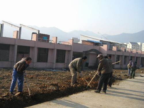 图为后勤公司员工正在铺设路灯