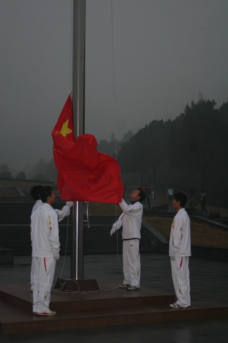 6点50分,只见四名护旗手身着洁白的服装,精神抖擞地护卫鲜红的国旗来到旗杆前。7点整,升旗仪式正式开始,伴着徐徐上升的五星红旗,参加仪式的校优良学风示范班机械学院机制056班全体同学响亮地唱起了国歌,正准备到教室晨读的同学们纷纷加入到队列中,爱国爱校的情怀在此刻得到升华。参加仪式的史方敏同学说:“我们将以饱满的热情,昂扬的斗志迎接教育部对申搏的本科教学工作水平评估,为学校添彩,为国旗增光!”