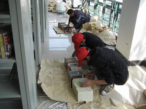 一到图书馆,志愿者们就分组开始了工作。擦书架、擦书立、搬书、分类、排序……干得热火朝天。所有人都忙碌认真地工作。他们与勤工助学的同学以及指导老师一起,把堆积如山的图书排成了一条条长长的“书龙”,再把“书龙”排到书架上。