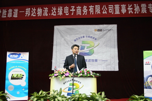 10月29日晚,第17期“优秀企业家进校园”活动在学院路校区举行。邦达物流、达缘电子商务董事长孙震应邀为新生作精彩报告。校党委副书记陈浩出席活动。300余名新生和KAB俱乐部成员聆听了讲座。