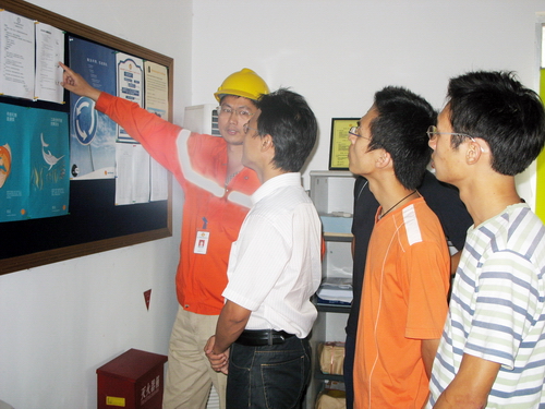 一到目的地,队员们就走入产区开始进行实践内容。穿上厂方特意准备的全套工作装备,队员立即有了“企业人”的感觉。队员们首先参观了公司,亲身体验企业文化氛围和了解最新的技术与产品。看到炎热气候下,虽然汗流不止依然身着厚重工作装备一丝不苟操作的一线员工,许多队员深有感触,一名队员说:“作风严谨,严格遵守规章制度,这是我今天最深刻的体会。”
