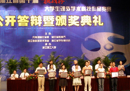 “挑战杯”大学生课外学术科技作品竞赛是一项具有导向性、示范性和群众性的竞赛活动,被誉为大学生学术科技的“奥林匹克”盛会,该项赛事现已成为高校之间彰显办学水平、教育质量和学生综合素质的一个重要窗口。为备战本届赛事,各二级学院从2006年下半年就对该项竞赛进行了组织发动,校团委在今年4月份组织评审委员会对二级学院推荐的40项作品进行评选,选拔了25件作品参加全省竞赛。其中生化学院王辉等同学的《新型孢子止血药的研究及产品的开发》,机械学院陈谦等同学的《防溅防雾化汽车轮胎罩》获得二等奖;生化学院胡紫颖等同学的《泔水饲料生物转化微生态饲料的研究》,生化学院张静等同学的《红曲保健果醋的开发研究》,信息学院潘晓虹等同学的《基于WEBGIS的在杭高校信息服务平台》,信息学院徐娅芳等同学的《外贸服装ERP系统》及经管学院李凯等同学的《双阶手机汉字输入法》获三等奖。