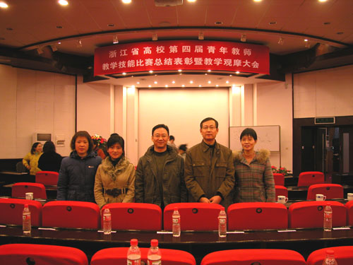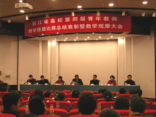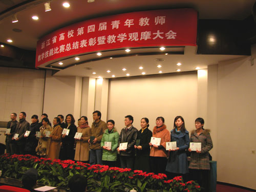 浙江省高校第四届青年教师教学技能比赛总结表彰暨教学观摩大会于2006年12月30日在浙江大学玉泉校区邵科馆报告厅隆重召开。来自全省各高校的青年教师代表、分管校领导和高校教务处、工会负责人及各市教育工会主席参加了大会。申搏党委书记徐志平、教务处长冯军、工会副主席苗红亚和受表彰的3位青年教师出席会议。省委教育工委副书记、省教育厅副厅长沈敏光代表高校青年教师教学技能比赛组委会,结合本届比赛工作总结讲话,省总工会副主席姚炳甫出席会议并讲话,东道主浙江大学党委副书记王玉芝,省总工会常委、经济部部长张彤和省教育厅高教处处长方永平、省教育工会副主席陈勇等出席会议并为获奖的青年教师代表颁奖。会议由省教育工会主席秦素琴主持。大会表彰了申搏严永仙、魏培莲、黄竹也等147名获浙江省高校第四届青年教师教学技能比赛优秀奖的青年教师。
