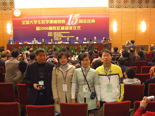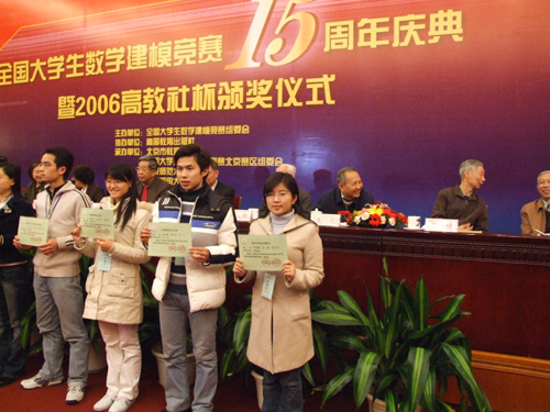 2006年12月29日-30日,申搏全国大学生数学建模竞赛一等奖获得者钟晓静(理学院)、裘威威(生化学院)、徐黎明(机械学院)代表浙江省获奖学生赴京参加在人民大会堂新闻发布厅举行的2006年度全国大学生数学建模竞赛颁奖大会和数学建模竞赛十五周年庆典活动。