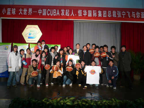 谈到风靡全国的大学生CUBA比赛,张宁飞说:“CUBA的宗旨就是育人,发展高校篮球,为国家输送人才。CUBA一直想通过自身的努力推动中国篮球体系的建立,通过篮球体系的建立来促进整个国家体育系统的成熟”。他说“体育带给我们的应该是一个终身锻炼的习惯——每天锻炼一小时,健康工作五十年,幸福生活一辈子。通过CUBA的品牌活动来影响当大大学生对体育深度的再认识,真正使体育成为国家主流发展事业的一部分,使我国跻身于世界体育强国之林。风趣的演讲不时博得了同学们热烈的掌声。