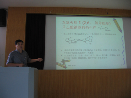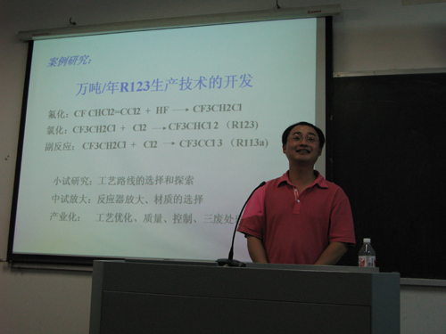 联合国环境发展署(UNEP)制冷技术选择委员会中国委员、国家ODS替代品工程技术研究中心办公室主任、国家履行禁止化学武器公约工作领导小组办公室外聘技术专家、浙江蓝天环保高科技股份有限公司副总工程师、研发部经理、浙江省化工研究院ODS替代品研究所副所长张建君教授级高工为申搏学生作了题为“国内外ODS替代品研究开发新进展”的课程讲座。他从大家关心的臭氧层空洞形成和对人类危害谈起,通过亲身经历的我国ODS替代品研制过程及在国外及国际会议场合经历的案例,向同学们介绍了化学工程实验室过程、中试放大过程和产业化过程等全方位研发历程,进一步增强了理论知识的感性认识。