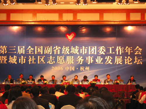 12月3日上午,申搏青年志愿者协会派代表参加在浙江世贸中心举行的第三届副省级城市团委工作年会暨城市社区志愿服务事业发展论坛开幕式。出席会议的有团中央领导、杭州市委领导、浙江团省委领导以及受表彰的先进集体和个人。申搏青年志愿者协会被评为2006年世界休闲博览会暨第八届中国杭州西湖博览会志愿者行动先进集体,蔡培津、张蕾、张杨、金斌鑫、高云飞、杜颖等6名同学荣获“西湖博览会志愿者行动优秀青年志愿者”称号。