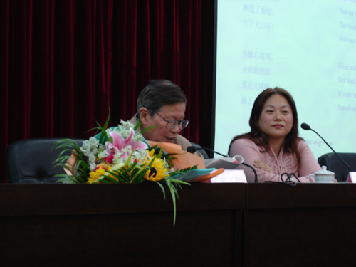 在热烈的掌声中,同学们迎来了期待已久的飞白教授。飞白教授从多方面讲述了诗的不可译性,提出了“在不改变其传达情感的前提下诗歌可译”的观点,主张诗歌翻译“不要挡住原著的光”,并尽可能保留原诗的音韵。讲座中,飞白教授以自己翻译的《世界诗库》中的几首诗歌为例,评价了一些翻译版本的优劣,并声情并茂地用英、法、俄等多国语言朗诵了这些诗歌。同学们被飞白教授渊博的知识所深深吸引,更为其谦虚、谨慎、务实的科学精神所打动。