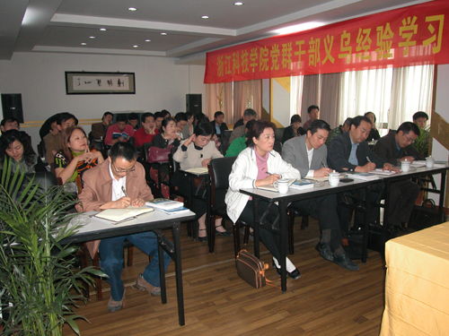 11月10—11日,学校党委副书记胡浙平、陈浩,校党委委员、组织部部长黄丰平带队,组织党群干部到义乌实地考察,感受“义乌发展经验”,从实践中理解邓小平理论和“三个代表”重要思想,理解科学发展观和党的十六届六中全会精神,义乌市人大常委委会副主任张荣山专程看望大家,中共义乌市委常委、市委宣传部部长陈秀仙专门为大家作了义乌发展经验的报告。报告会由学校党委副书记胡浙平主持。