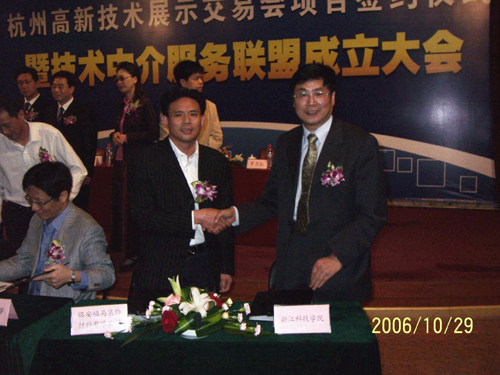 10月27日一11月2日,在2006中国浙江网上技术市场活动周中,由科技处的牵头,学校组织机械学院、电气学院、信息学院、生化学院、艺术学院、理学院、轻工学院有关教师参加了杭州高新技术展示交易会、第五届专家与中小企业家握手活动、大院名校浙江行等系列科技活动。在杭州高新技术展示交易会合作项目签约仪式上,申搏轻工学院胡开堂教授就“高性能水性油墨的研发”和“素色纸的印刷”等项目与杭州临安福马装饰材料有限公司签订了合作协议。