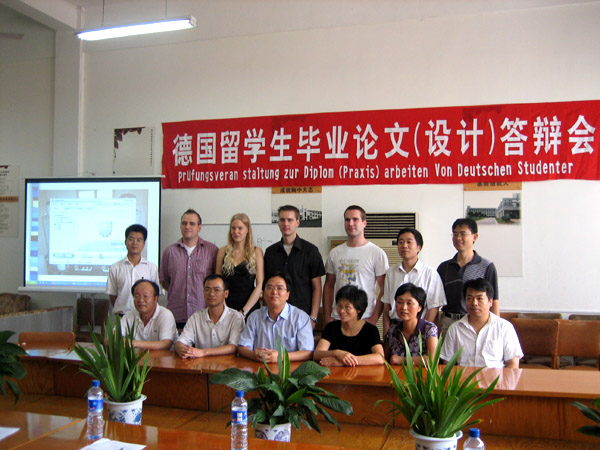 答辩会上,四位同学分别详细介绍了实习和毕业论文(设计)期间所从事的实验研究和工业应用工作,并对实验结果给出了合理的推理,参加答辩会的老师对论文中涉及的相关问题进行了提问,四位同学分别进行了详细的解答。答辩过程中,四位同学思路清晰、表述流利、论证充分,整场答辩会在紧张、热烈、友好的学术氛围中进行了充分的交流。最后,Andre Meyer与Andre von der Enbse两位同学以优异的成绩通过毕业论文(设计)答辩,Christiüne Prortner与Christian Bardroff两位同学也以优异的成绩通过实习答辩。