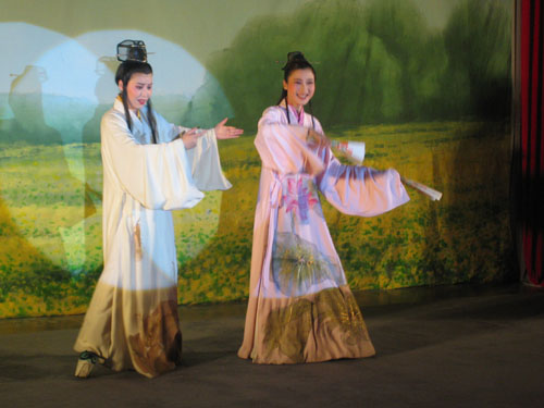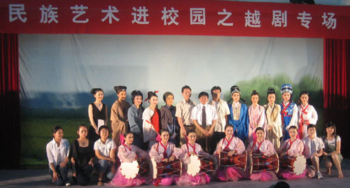 越剧团在申搏连续表演了两场,内容既有经典剧目《梁祝•十八相送》,古典名著改编剧目《西厢记•传简》、《窦娥冤•斩娥》、《赵氏孤儿•夺子》,又有现代名著改编剧目《祥林嫂•抬头问苍天》和朝鲜名典名著改编的《春香传•端阳歌》。同学们热情高涨,与剧中人物同喜同悲,被演员们的俊美扮相、柔美唱腔和传神演绎深深感染,场内不时响起了阵阵的掌声。演出结束后,学校领导上台和演员们亲切握手和问候,浙江小百花越剧团特意赠送了他们演出的纪念光盘。