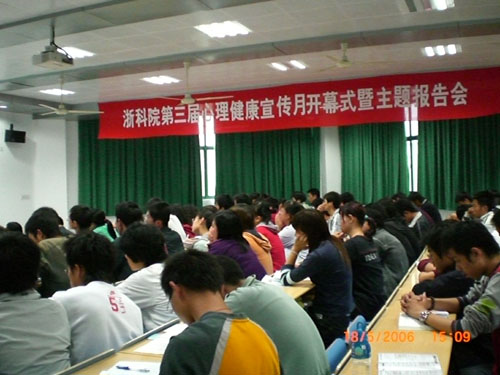 5月18日(周四)下午,浙科院第三届心理健康教育宣传月开幕式暨主题报告会在C1-206拉开帷幕。校党委副书记胡浙平,校学生处处长陈跃泉,校团委书记郑友取等领导出席了开幕式。浙江大学王东莉教授应邀作了题为“大学生人际交往心理调试”的主题报告。参加本次心理健康教育宣传月开幕式的还有各二级学院的辅导员,各行政班心理委员及广大同学。