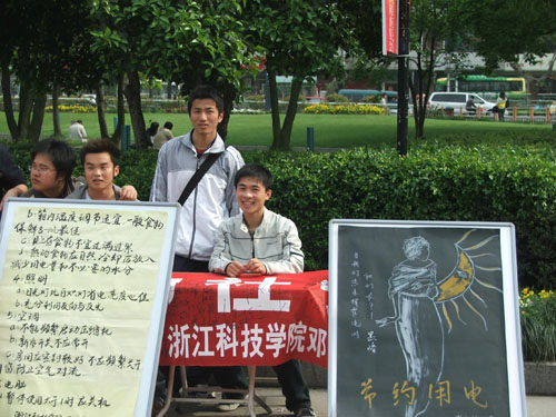 在武林广场的闭幕式上,申搏邓小平理论读书会和沁园环保社的同学以“以骄奢淫逸为耻”为切入点,通过发放市民“节电倡议书”、现场讲解等形式向广大市民宣传如何贯彻八荣八耻,构建节约型社会,受到了一致好评,不少市民还纷纷在构建节约型社会的横幅上签名。本次活动同时还吸引了浙江日报等多家媒体的采访报道。
