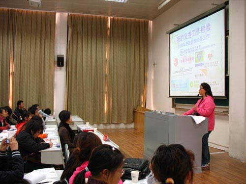 供职于杭州志愿者培训中心的香港义工桑吕敏妮特邀作了专题讲座。桑吕敏妮首先介绍了香港志愿服务事业的发展历程,香港义务工作申搏,讲述了自己从十几岁开始走上志愿服务道路的经历和感受。在场的200多位听众都被她这种至真至诚的奉献精神所感染,掌声四起,同学们纷纷立志要当一名志愿者,为构建和谐社会奉献爱心和智慧。
