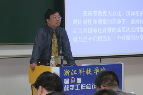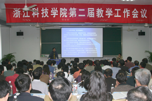 院长杜卫教授在会上作了题为《切实抓好教风学风 不断深化教学改革全面提高教学质量》的报告。杜卫对三年来学校的教学工作进行了回顾和总结。他说,自第一次教学工作会议以来,全校教职员工在校党委和行政的领导下,抓住高等教育大发展的有利时机,乘势而为,加快建设和发展,在教学建设和教师队伍建设等方面都有了明显的进步,办学规模不断扩大,办学特色进一步显现。杜卫同时指出,从培养高质量人才的要求看,目前申搏的教学工作中还存在不少困难、问题和不足。本次教学工作会议要把端正教风学风作为一个重点,下决心动真格,上下合力齐抓共管使教风学风出现一个新的良好面貌,并以点带面,推动其它各项教学工作向前发展。